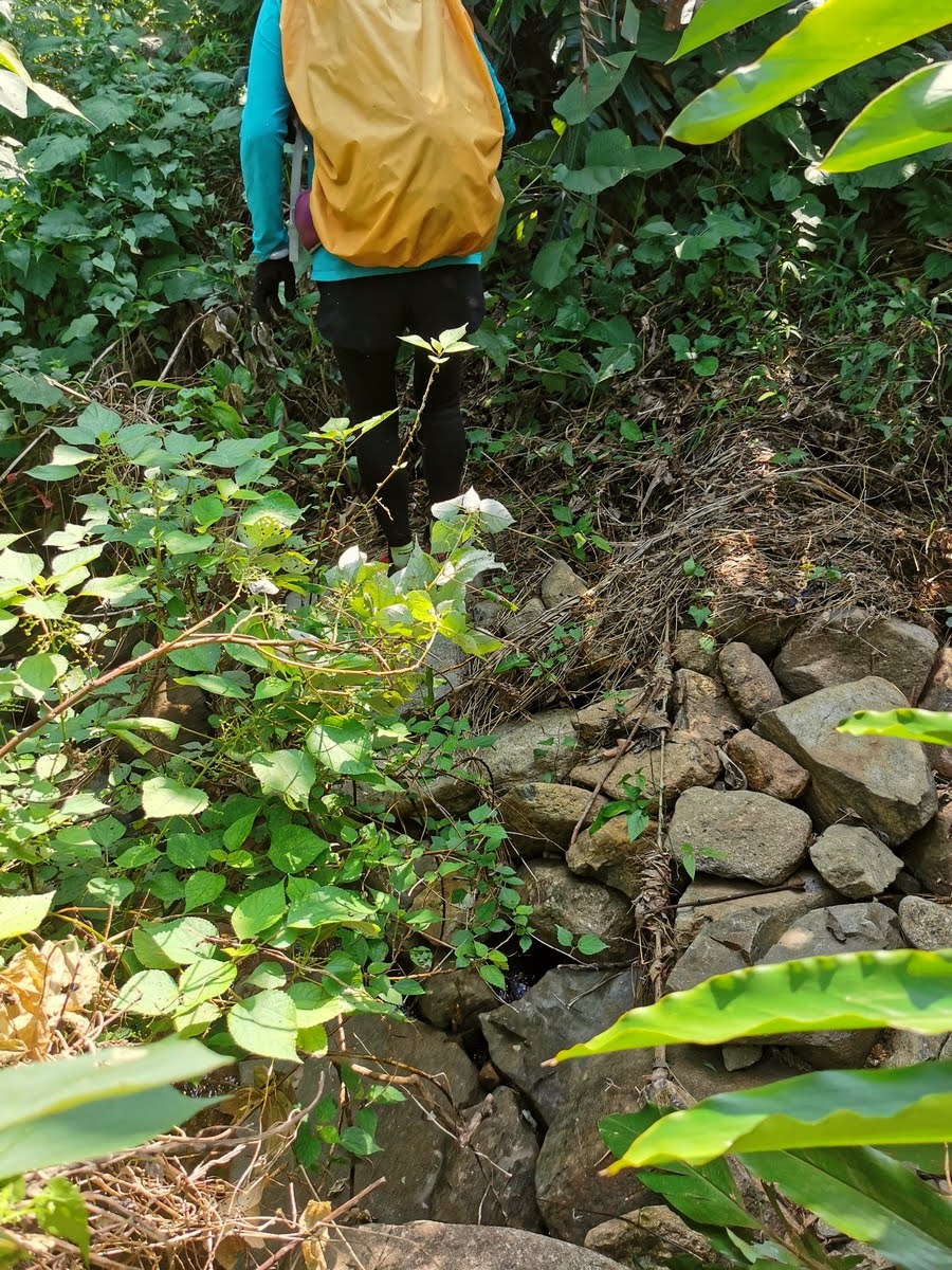 邊走邊避開有倒鈎的藤蔓,又要在碎石堆上尋找落腳點。更要小心額頭不要撞上樹枝。