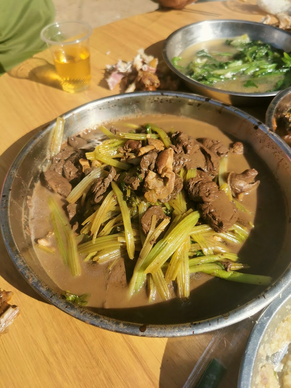 兩間農家樂都有食客。問老闆「有位麼?」她當然說「有!」又說有兩枱客未到。有一枱客對我們說「好吃!」。那就試試這間吧。食店只有夫婦兩人主持,兩人都已經很忙。於是我們搬枱又搬凳,自己斟茶。